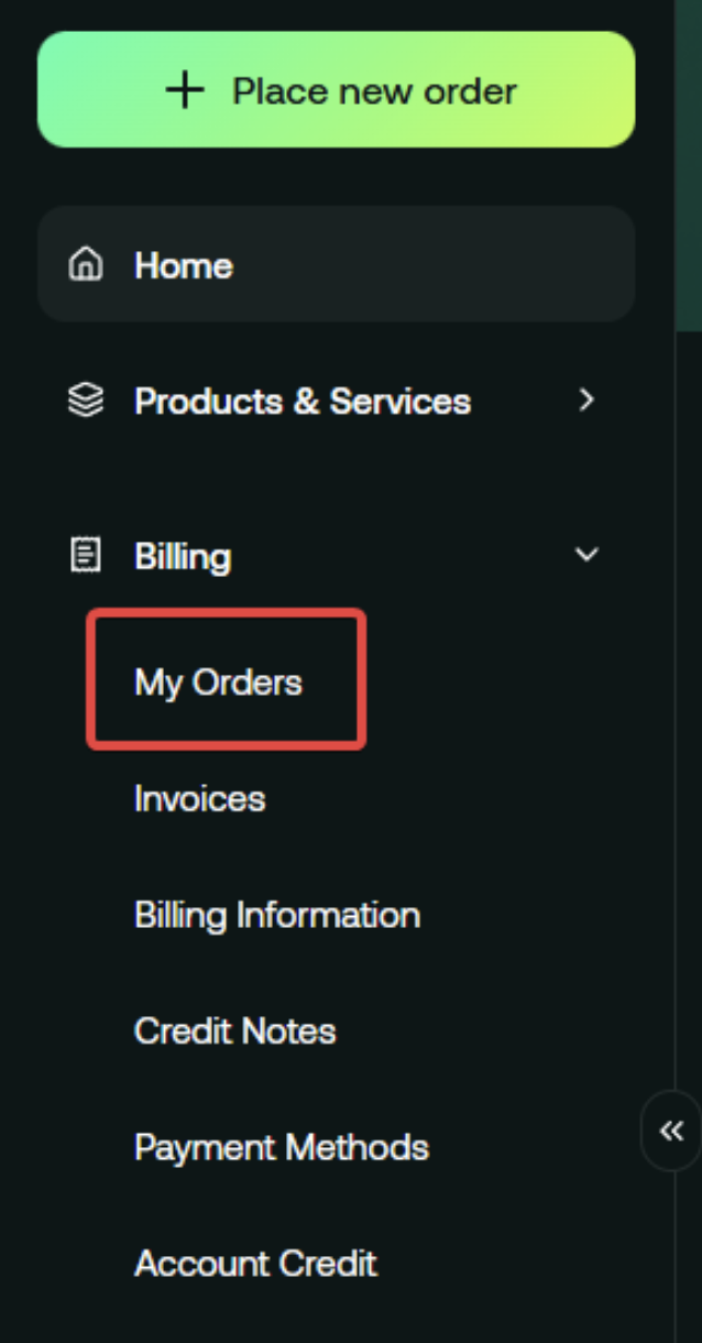 To access your billing and orders, simply click Billing. That will expand a menu with all the billing-related links. In there, you will find Orders (you can also click on your initials in the top-right of the screen, which will also send you to your orders).