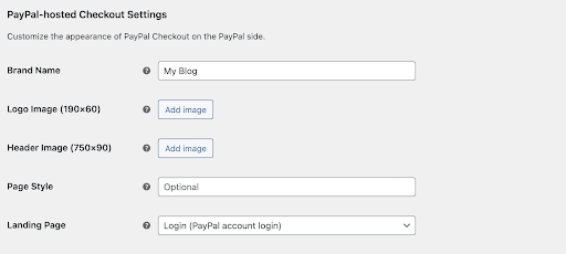 In the PayPal-hosted Checkout Settings section, enter details such as your Brand Name, your site or product name, images for logo and header, and so on to ensure the PayPal checkout page has the same look and feel as your website. The landing page is the URL that all customers see when they check out.