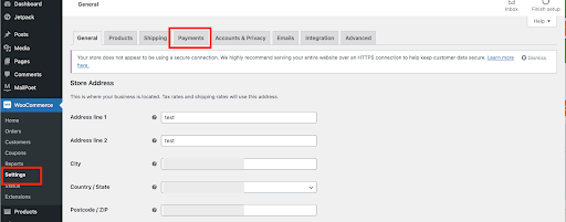On the WordPress Dashboard, in the left sidebar, click WooCommerce, and then click Settings. This will take you to the WooCommerce settings page, which has multiple tabs for various settings. To enable the payment method, navigate to the Payments tab.