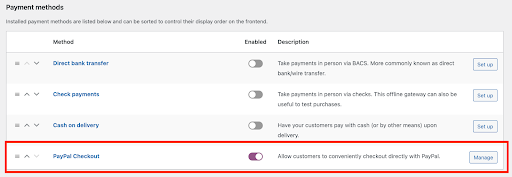Enable the toggle button next to the PayPal checkout option on the Payment Methods page. To configure the PayPal Checkout settings, click Set up or Manage.