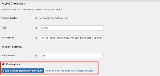 In WooCommerce, you can use the API settings to create or link an existing PayPal Account. To link it to your PayPal account, use the API credentials sections on the PayPal Checkout setup page, under the payment tape.
