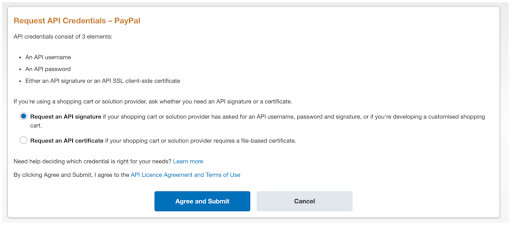 Next, scroll to NVP/SOAP API Integration (Classic) and click Manage API Credentials. Ensure Request an API Signature is checked and click Agree and Submit.