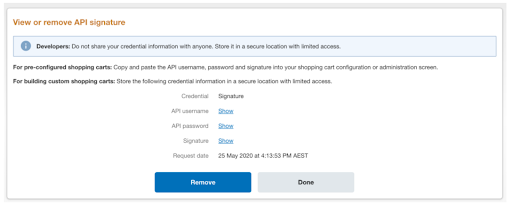 Click Show to reveal API Username, password, and signature.