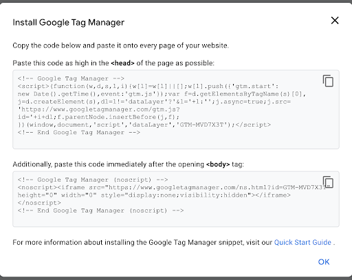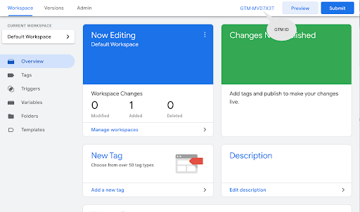- To begin, click on the GTM ID on the top navigation bar to retrieve the GTM code. Edit the header.php template and paste the code right after tag.
