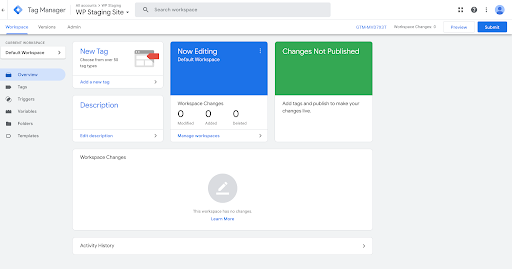 The final step to complete this Google Tag Manager setup is to use the Google Tag Manager dashboard to publish the container.