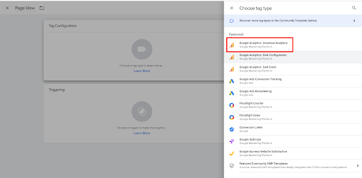 - Choose the tag type. For this blog, we will use the Google Analytics: Universal Analytics