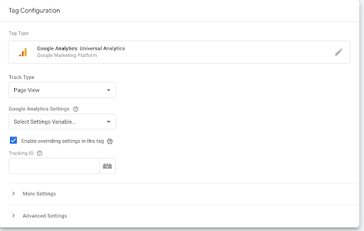 - Next step is to configure the tag. On the Tag Configuration screen, check the “Enable overriding settings in this tag” option. Get the Tracking ID code from your Google Analytics account and paste it into the Tracking ID.