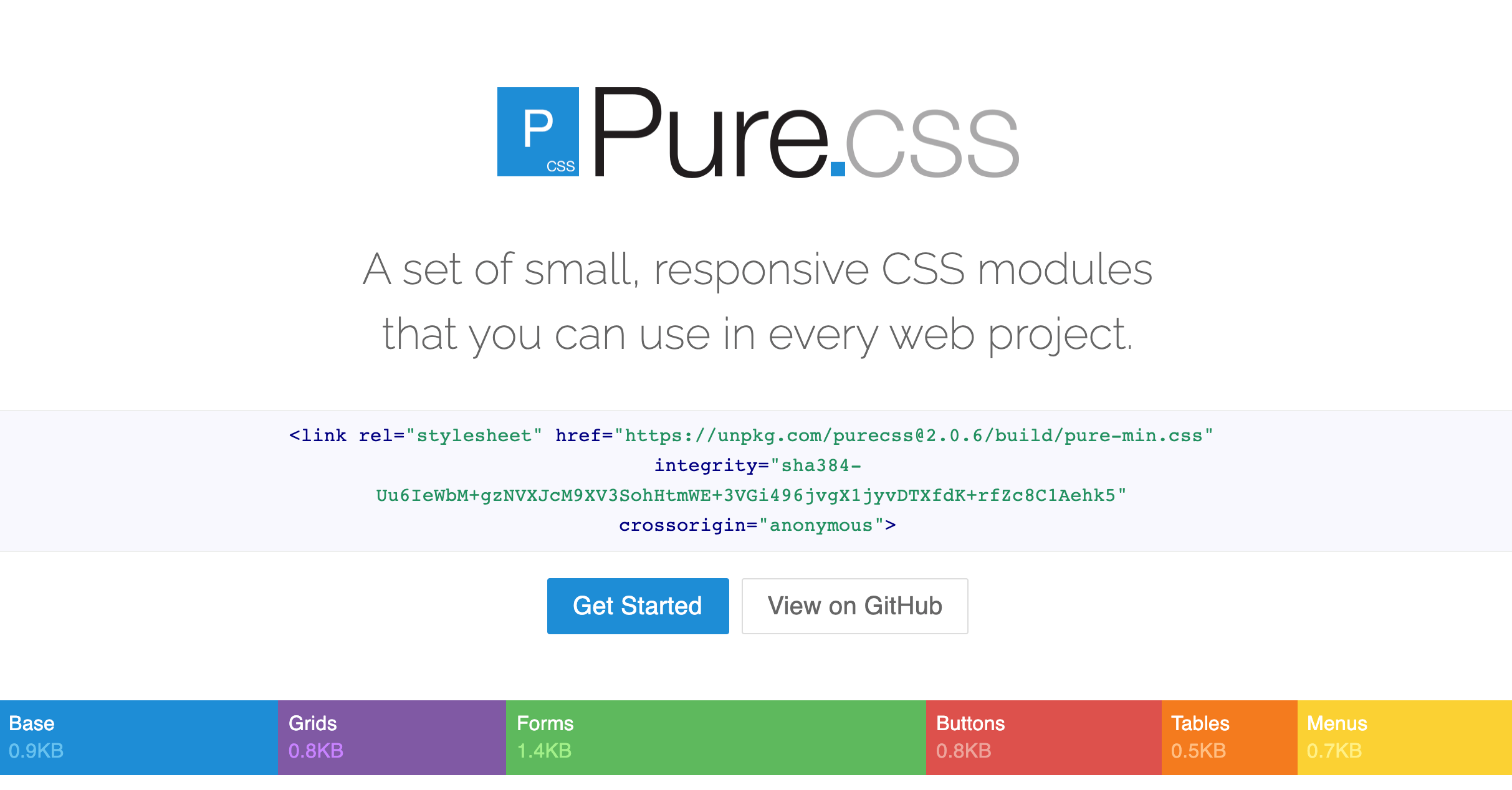 Coming in at 3.87B minified and gzipped, this is a simple, lightweight framework. If you only require a subset of Pure’s modules, you’ll save even more bandwidth. This makes Pure ideal for smaller projects, or any project that has modest requirements.