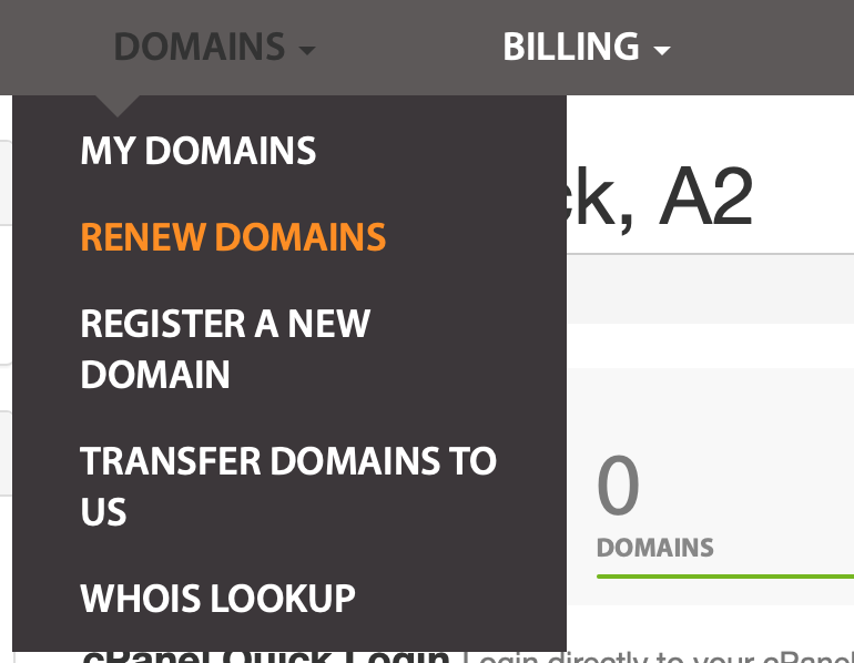 Start off by logging into the Hosting.com Customer Portal. From the menu bar, select Domains, then Renew Domains: