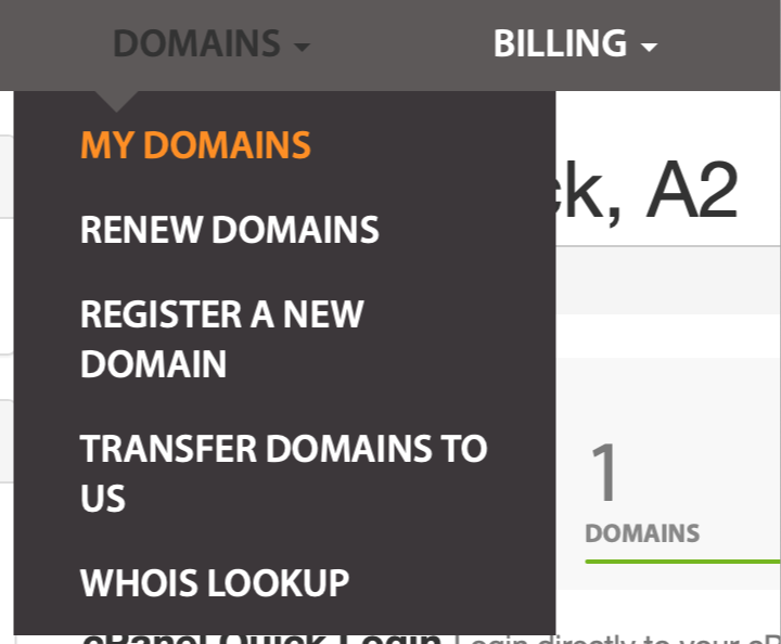 If you feel you’re likely to forget to do this manually, you can also set up automatic renewals. Again, after logging into the Customer Portal, navigate to Domains from the menu bar and select My Domains from the drop-down list:
