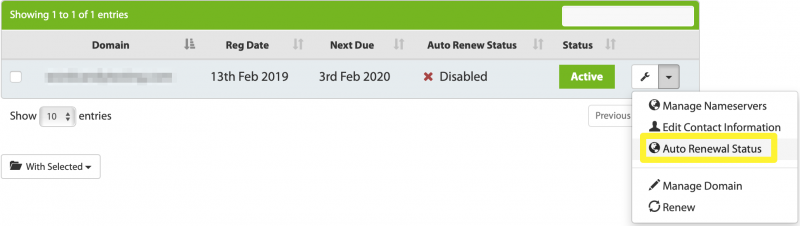 Here, find the domain you want to set up automatic renewals for, and click the associated 'down' Arrow icon. Next, select Auto Renewal Status: