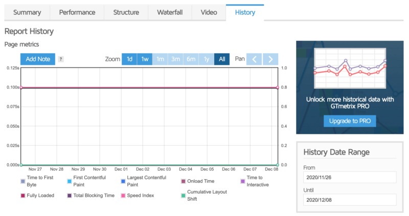 After activating Memcached, you may want to test your website’s performance. This can help you evaluate the impact Memcached has on key metrics, particularly page load times. You can re-run GTmetrix, and compare the results using the tool’s History tab.