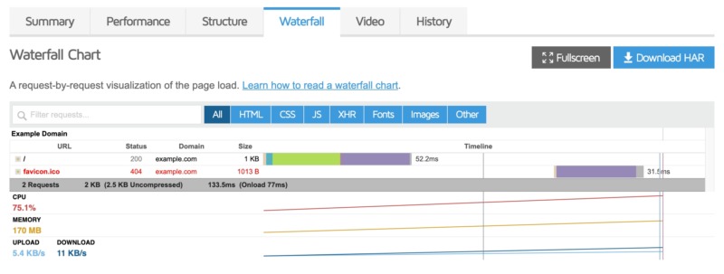 This report is divided into several tabs. The Waterfall tab displays a visual representation of how every single asset on your website loads. This includes your CSS, HTML, JavaScript, images, and plugins. You can use the provided waterfall graph to analyze how each asset is impacting your site’s loading times.
