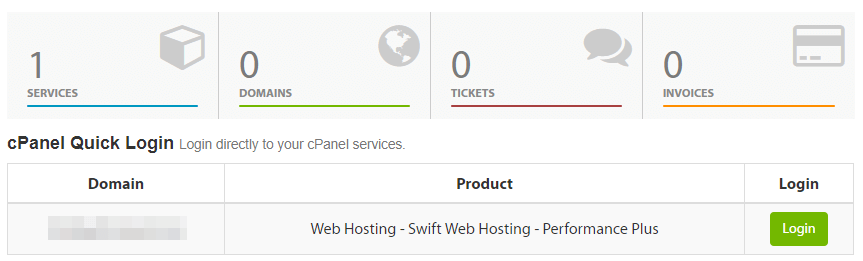 Afterward, you'll see an overview of all the services you're subscribed to, including your hosting plans and domains. Within that page, there's a subheading that reads cPanel Quick Login. Under it, you'll see a list of your domains with green Login buttons next to each: